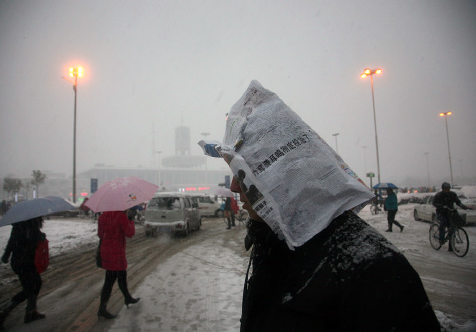 圖為一位行人將報紙折成帽子擋雪。 阿拉爾 攝