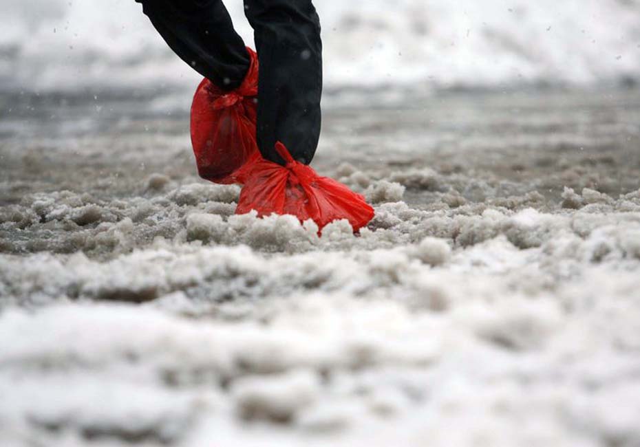 圖為行人在腳上套上塑料袋。崔華瑞 攝
