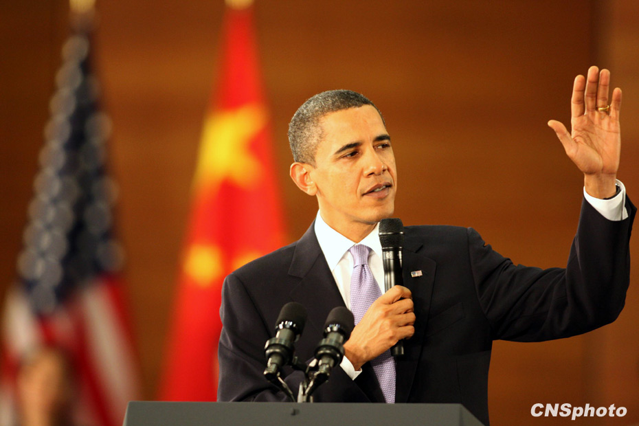 11月16日,正在上海訪問的美國總統(tǒng)奧巴馬現(xiàn)身位于浦東的上?萍拣^,與四百余中國青年進行面對面交流。 圖片來源:中國新聞網(wǎng)