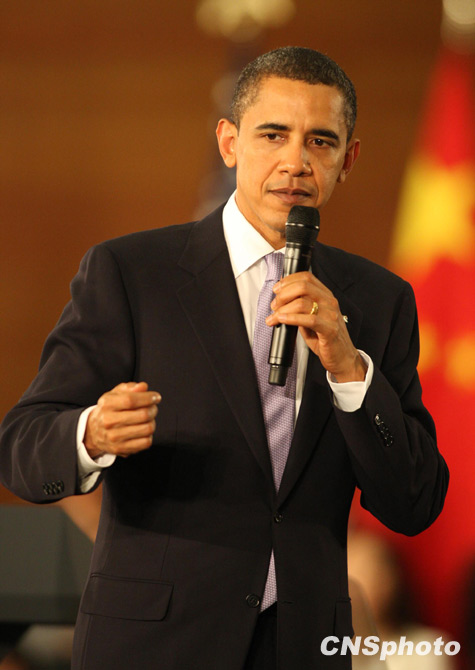 11月16日,正在中國進行國事訪問的美國總統(tǒng)奧巴馬,在上海就中美關(guān)系的未來發(fā)表演講。中新社發(fā) 湯彥俊 攝