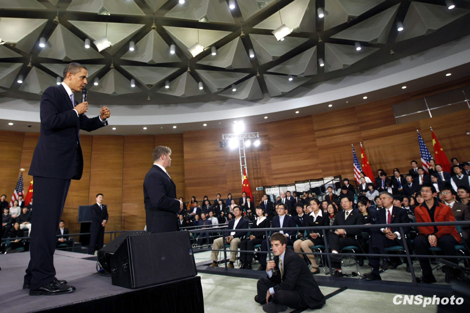 11月16日,正在中國(guó)進(jìn)行國(guó)事訪問的美國(guó)總統(tǒng)奧巴馬,在上海就與中國(guó)青年交流,并現(xiàn)場(chǎng)回答提問。中新社發(fā) 盛佳鵬 攝