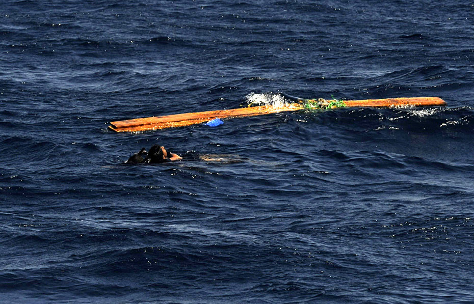 11月17日,亞丁灣,3名漁民抱著木板在海面上漂流3天后獲救。據(jù)悉,他們?cè)庥隽耸畮酌伤坪1I的劫持,海盜們讓其選擇或跳海逃生或被殺死。圖片來源:中國(guó)新聞網(wǎng)