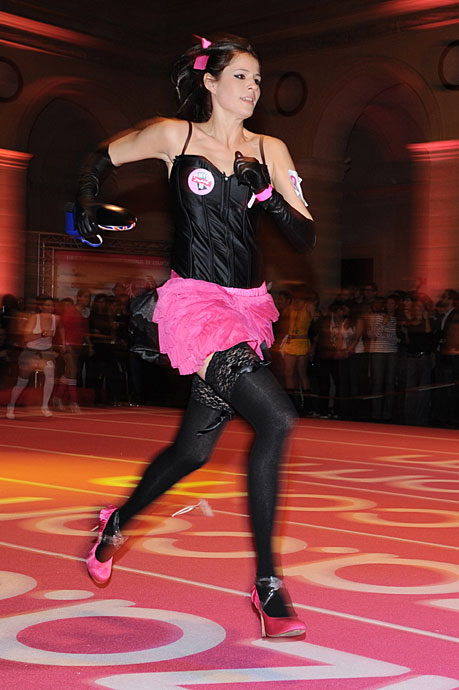 11月20日,法國巴黎舉行了有趣的室內(nèi)高跟鞋賽跑比賽,總共32支隊(duì)伍96人一爭高下。圖片來源:中國新聞網(wǎng)