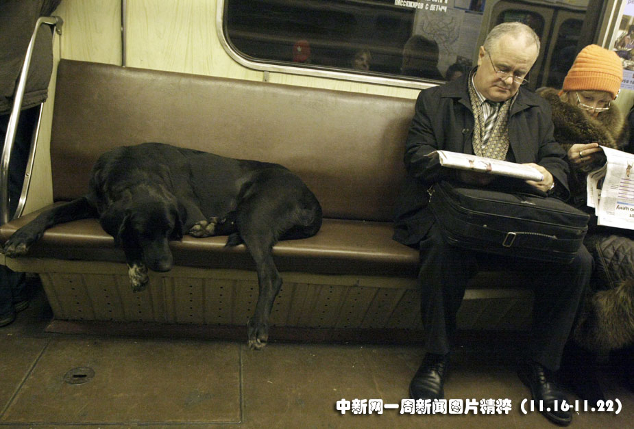 2009年11月18日,俄羅斯首都莫斯科的一只流浪狗與乘客同乘地鐵。圖片來源:中國(guó)新聞網(wǎng)