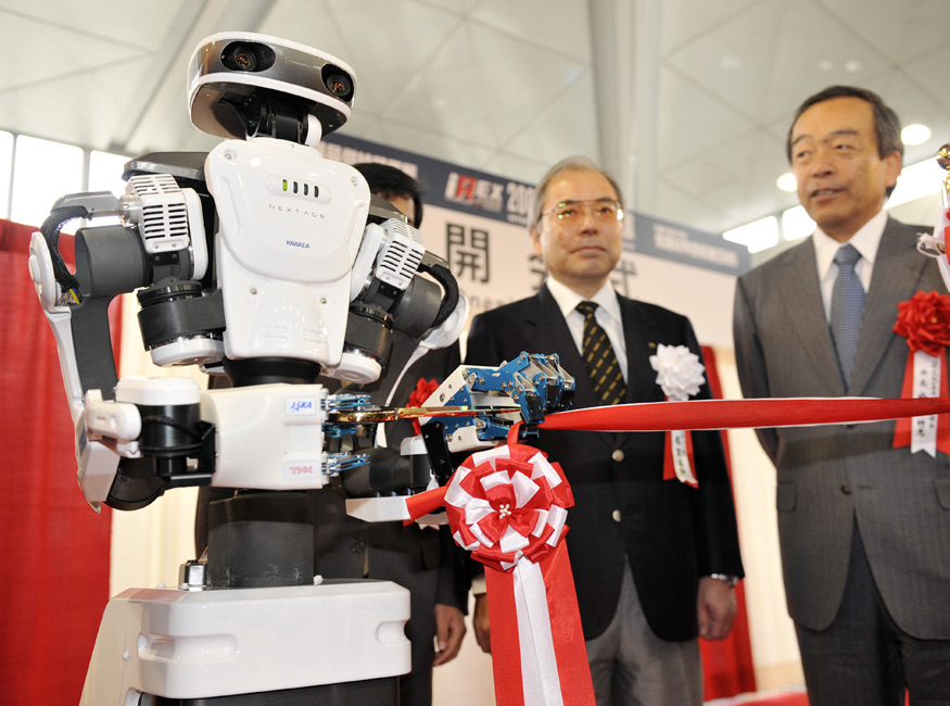 11月25日,日本東京舉行了國(guó)際機(jī)器人大展,約200家企業(yè)和研究機(jī)構(gòu)攜機(jī)器人研發(fā)領(lǐng)域的最新成果參加本次為期4天的展覽。圖為最新研發(fā)的機(jī)器人Nextage與嘉賓共同剪彩。