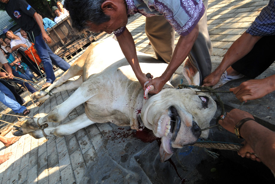 11月28日,世界各國(guó)的穆斯林迎來(lái)傳統(tǒng)節(jié)日“宰牲節(jié)”。圖為印度尼西亞的穆斯林在宰牲節(jié)上宰殺牲畜。