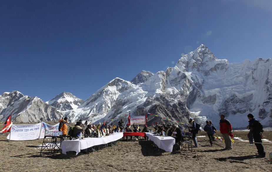 12月4日,尼泊爾總理和22位部長在喜馬拉雅山海拔5262米的高度舉行內(nèi)閣會議,討論全球變暖對喜馬拉雅山的影響。呼吁人們切實采取行動,保護環(huán)境。