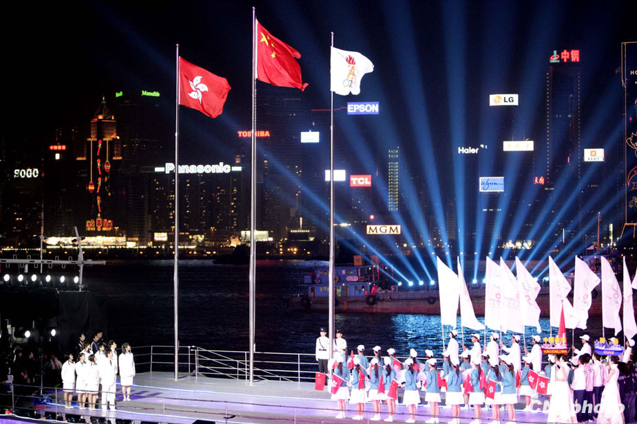 12月5日晚,第5屆東亞運動會開幕式在香港維多利亞港舉行,同時配以花船巡游、燈光效果和煙花匯演,成為一屆富有特色的水上開幕式。中新社發(fā) 盛佳鵬 攝