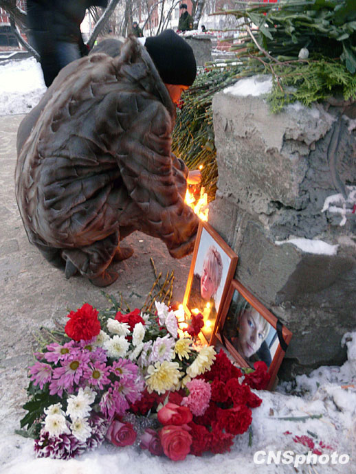 十二月六日,在俄羅斯彼爾姆市夜總會火災事故現(xiàn)場,一位俄羅斯婦女點燃蠟燭,悼念自己的親人。中新社發(fā) 田冰 攝
