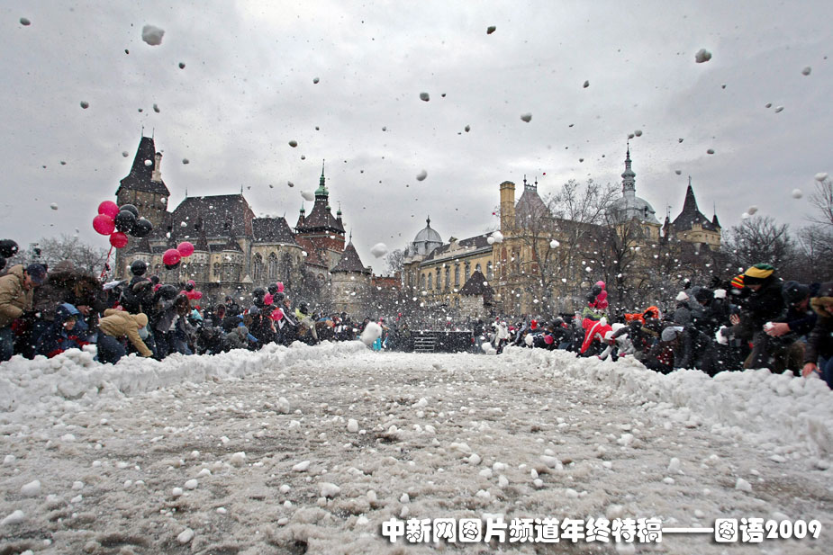 最多人集體打雪仗:1月31日,匈牙利一家公司組織人們?cè)谑锥疾歼_(dá)佩斯的一個(gè)公園內(nèi)集體打雪仗,他們希望打破美國(guó)密歇根理工大學(xué)在2006年創(chuàng)下的3700多名學(xué)生集體打雪仗的吉尼斯世界紀(jì)錄。圖片來源:中國(guó)新聞網(wǎng)