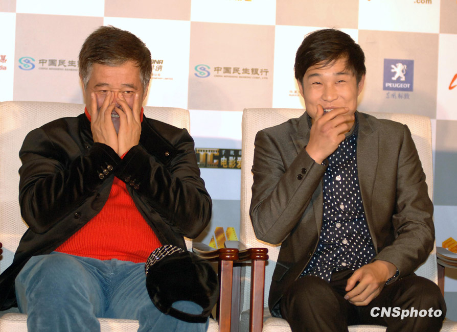 12月9日下午,張藝謀喜劇新作《三槍拍案驚奇》在京舉行首映發(fā)布會(huì),導(dǎo)演張藝謀、大病初愈的趙本山攜孫紅雷、小沈陽(yáng)、閆妮、倪大洪、程野、毛毛全明星主創(chuàng)團(tuán)隊(duì)齊齊亮相,F(xiàn)場(chǎng)張藝謀、趙本山、小沈陽(yáng)搞笑不斷,引得爆笑連連,上演了一出戲外喜劇。趙本山首度回應(yīng)了花兩億購(gòu)買私人飛機(jī)一事,稱還沒有定下來。張藝謀表示會(huì)和“趙家班”繼續(xù)深度合作,并且豪言預(yù)計(jì)未來的中國(guó)電影單部影片票房可能達(dá)到2億美元。圖為趙本山、小沈陽(yáng)師徒倆現(xiàn)場(chǎng)幾乎笑的“失態(tài)”。中新社發(fā) 李學(xué)仕 攝