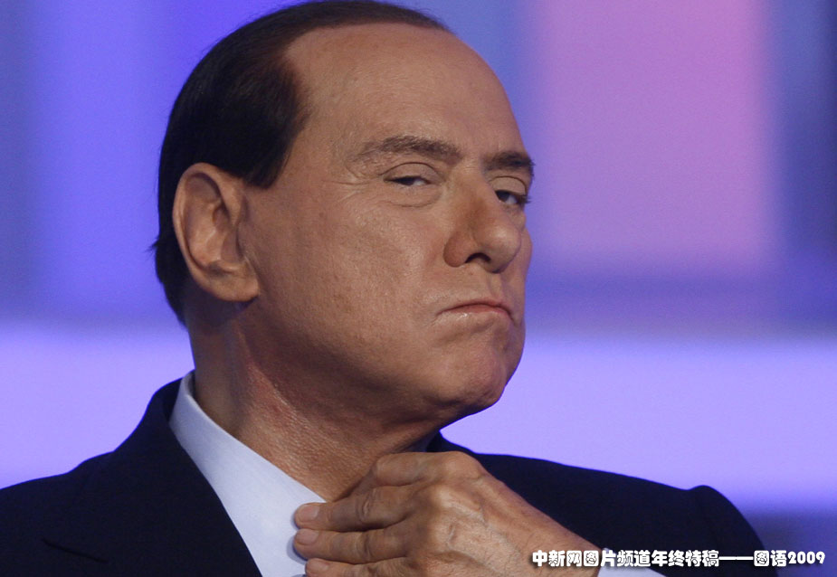 瀟灑的貝魯斯科尼:2009年9月25日,意大利總理貝魯斯科尼在接受電視采訪時整理領(lǐng)帶。貝魯斯科尼一直緋聞纏身,妻子也離他而去。