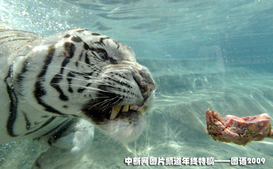 美國(guó)加利福尼亞,一只名叫奧丁的雄性孟加拉大白虎在水中“覓食”。它不僅一點(diǎn)也不怕水,而且出眾的游泳技能聞名。