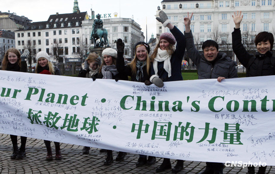 12月12日,正在丹麥哥本哈根召開(kāi)的聯(lián)合國(guó)氣候會(huì)議舉行部分與會(huì)國(guó)會(huì)外會(huì)議,500多個(gè)來(lái)自70多個(gè)國(guó)家和組織的成員以及當(dāng)?shù)丨h(huán)保者6萬(wàn)多人匯集哥本哈根市貝拉會(huì)展中心進(jìn)行大游行。圖為在哥本哈根環(huán)保大游行醒目的中國(guó)“環(huán)保先鋒行活動(dòng)”。 中新社發(fā) 錢(qián)興強(qiáng) 攝