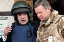 布朗戴頭盔看望士兵