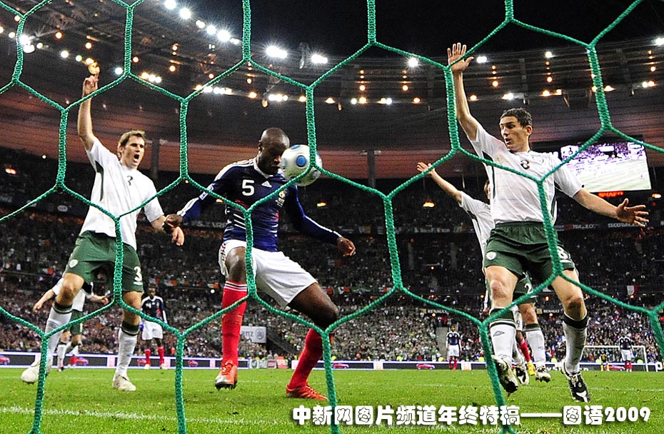 2010年南非世界杯預(yù)選賽法國(guó)對(duì)愛爾蘭第二回合的比賽周三在法國(guó)圣德尼舉行,在加時(shí)賽中,法國(guó)隊(duì)球員關(guān)鍵時(shí)刻的一記“手球”逃過裁判的眼睛,幫助后衛(wèi)威廉·加拉成功破網(wǎng),兩隊(duì)打成1:1平局,法國(guó)隊(duì)淘汰愛爾蘭第四次晉級(jí)世界杯決賽。圖為,在加拉射門時(shí),愛爾蘭隊(duì)隊(duì)員舉手示意有犯規(guī)動(dòng)作。