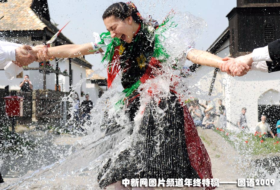 匈牙利迎接復活節(jié)“水潑美女”——4月9日,在布達佩斯東北部的一個小鎮(zhèn),當?shù)鼐用裱菥毩藗鹘y(tǒng)舞蹈和潑水活動,身著傳統(tǒng)服裝的男孩向女孩們身上盡情潑水。