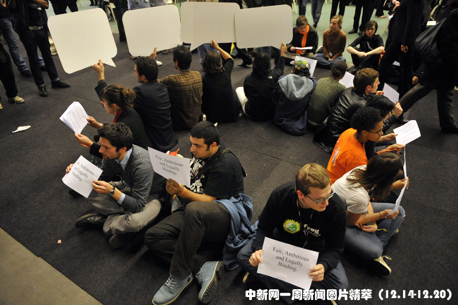 16日(周三),哥本哈根,一群年輕人在貝拉中心靜坐示威,要求聯(lián)合國氣候變化大會取得實質成果。圖片來源:中國新聞網(wǎng)
