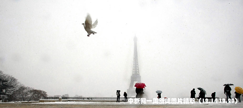 17日(周四),巴黎降下大雪,一只白鴿冒雪飛起,不遠處的埃菲爾鐵塔在雪中若隱若現(xiàn)。圖片來源:中國新聞網(wǎng)