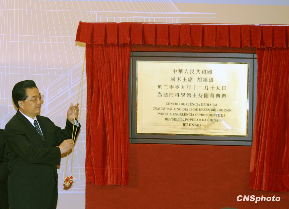 12月19日下午,國(guó)家主席胡錦濤在澳門出席澳門科學(xué)館開幕典禮并親手為之揭幕。中新社發(fā) 廖攀 攝