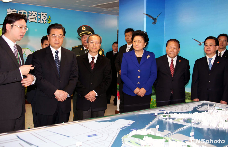 在訪問澳門的緊密行程中,中國國家主席胡錦濤十九日下午來到位于氹仔北安工業(yè)區(qū)的家居棄置物處理中心。胡錦濤聽取了澳門環(huán);ㄔO(shè)施沙盤及展示板介紹并參觀了控制室。中新社發(fā) 張朔 攝