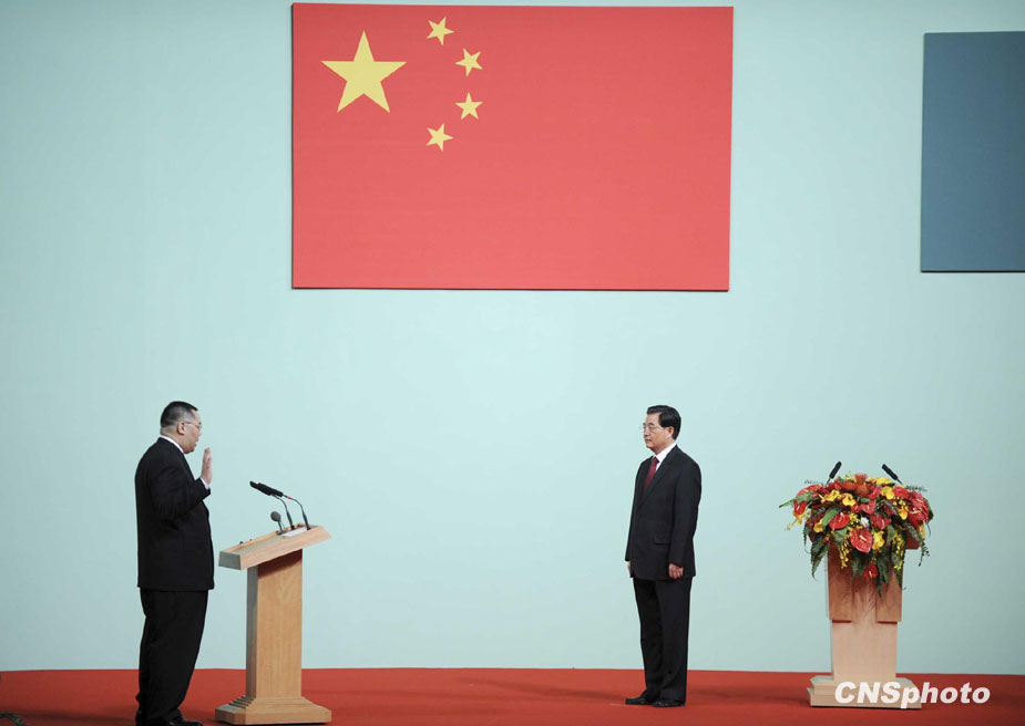 12月20日,慶祝澳門回歸祖國十周年大會(huì)暨澳門特別行政區(qū)第三屆政府就職典禮在澳門東亞運(yùn)動(dòng)會(huì)體育館舉行。澳門特區(qū)第三任行政長官崔世安宣誓就職,國家主席胡錦濤監(jiān)誓。中新社記者 廖攀 攝