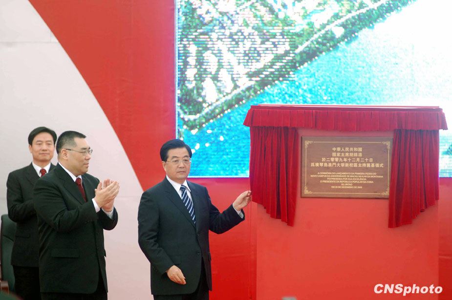 12月20日下午,國家主席胡錦濤在澳門第三任行政長官崔世安陪同下出席珠海橫琴島澳門大學(xué)新校區(qū)奠基儀式。中新社發(fā) 畢永光 攝