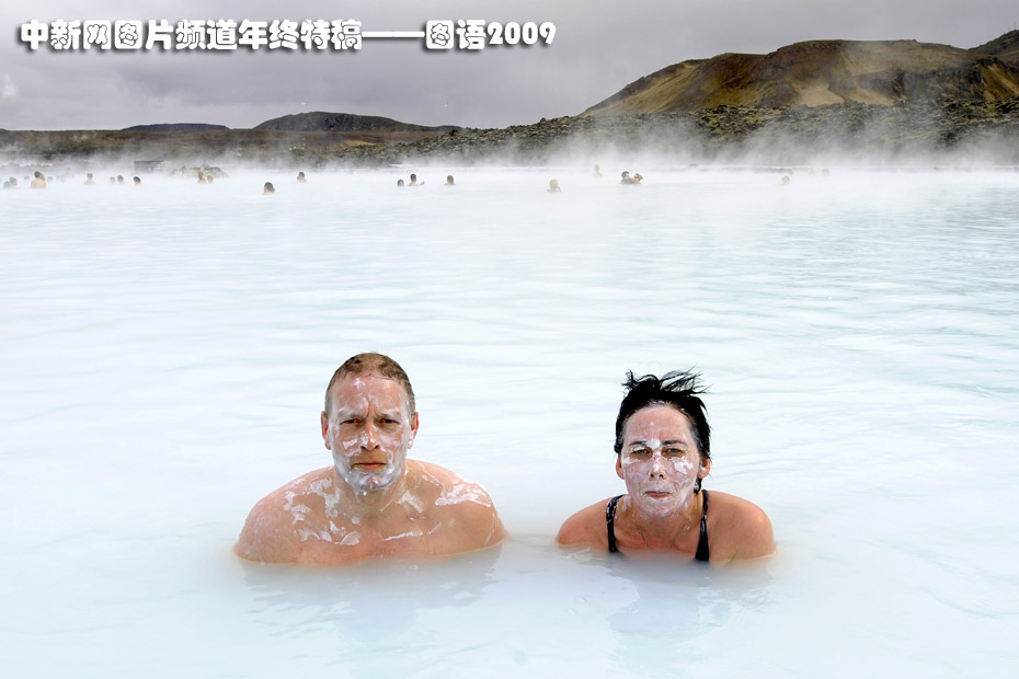 4月26日,兩名游客在冰島雷克雅維克藍(lán)礁湖泡天然熔巖流溫泉。