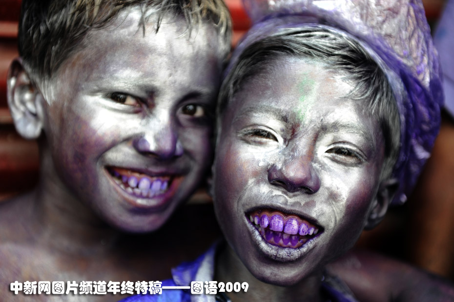3月12日,印度青年身涂彩色粉末慶祝春天的到來。