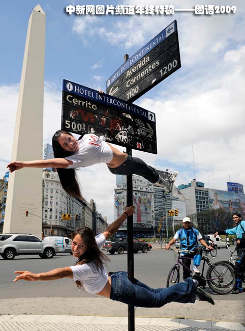 10月19日,阿根廷布宜諾斯艾利斯市街頭,鋼管舞小姐在街頭表演,路邊的路燈、電線桿變身為鋼管舞道具。