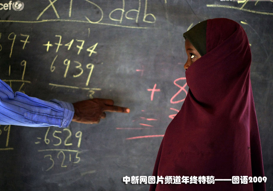 2009年6月15日,一位流離失所的女孩在索馬里的一個難民營內(nèi)上課。