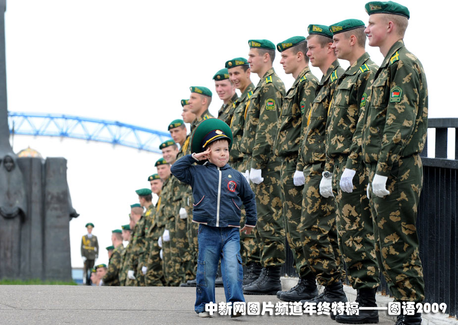 2009年5月28日,白俄羅斯邊防日,一名男孩向士兵們敬禮。