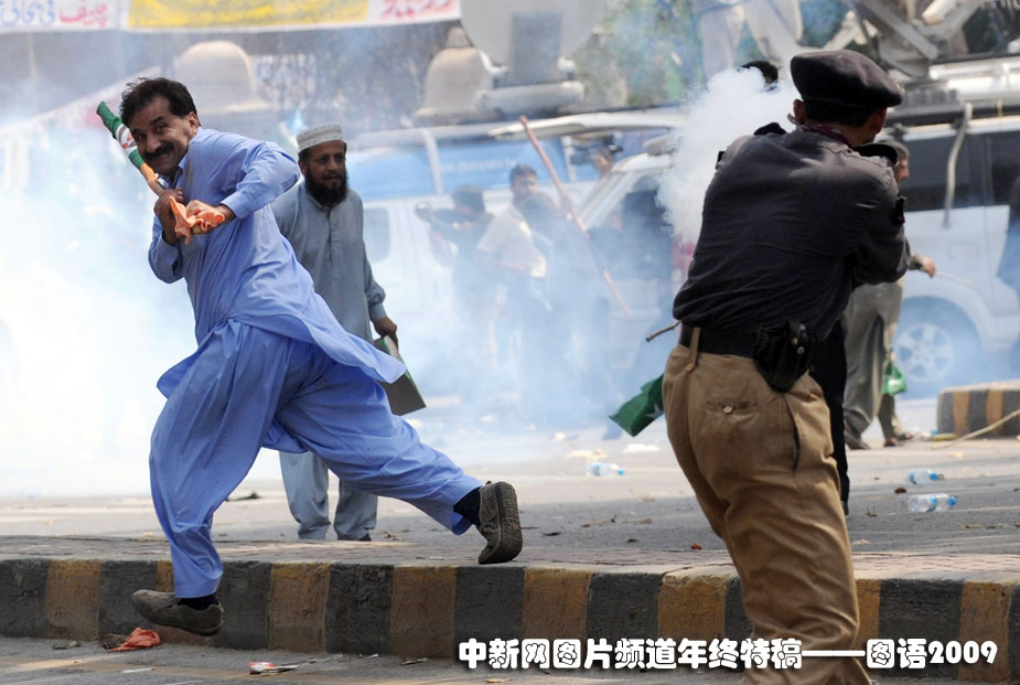 2009年3月15日,巴基斯坦前總理謝里夫的支持者在拉合爾舉行抗議集會(huì)時(shí)與警察發(fā)生沖突。