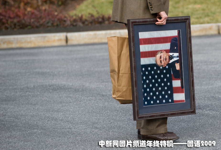 2009年1月17日,一位美國(guó)白宮職員在白宮外手持上一任總統(tǒng)小布什的照片。一周前美國(guó)新任總統(tǒng)奧巴馬宣誓就職。