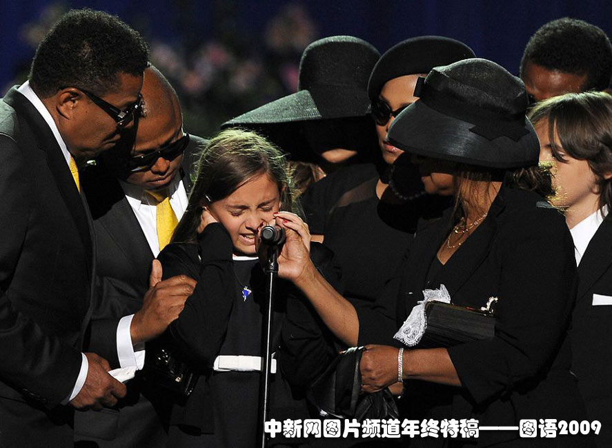 2009年7月7日,在洛杉磯斯坦普斯中心舉行了紀(jì)念邁克爾·杰克遜的追思會(huì)。邁克爾·杰克遜是樂(lè)壇傳奇,死于2009年6月25日。追思會(huì)上,邁克爾·杰克遜的家族成員正在安慰的杰克遜的女兒帕麗斯(中)。