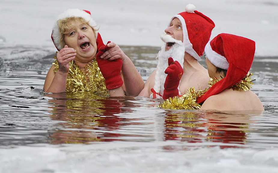 12月25日,德國(guó)柏林的冬泳俱樂(lè)部“柏林海豹”(Berliner Seehunde)的成員不畏寒冬,光著身子在已經(jīng)結(jié)冰的Oranke湖中暢游一番。圖片來(lái)源:中國(guó)新聞網(wǎng)