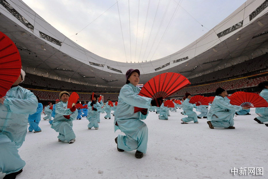 2010年1月1日上午,2010人在被冰雪覆蓋的鳥巢內表演了太極拳、武功扇等民族傳統(tǒng)健身項目。中新網記者 金碩 攝