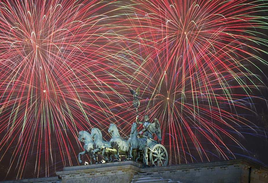 圖為2010年1月1日,焰火在德國(guó)柏林勃蘭登堡門上空綻放,慶祝新年的到來。