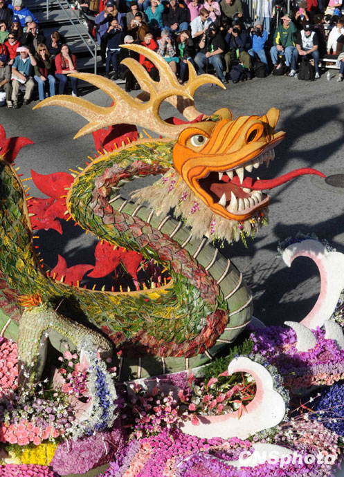 美國當(dāng)?shù)貢r間1月1日,第121屆美國玫瑰花車大游行在加州帕薩迪納市隆重舉行。著名影星成龍助陣中國上海世博花車。圖片來源:中國新聞網(wǎng)
