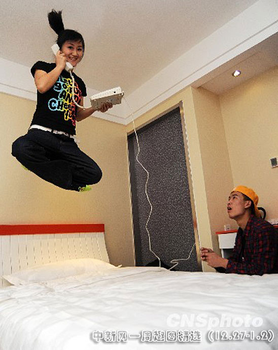 2009年12月26日,山東濰坊年輕人在濰坊一家酒店玩“跳床”。每當周末,山東濰坊“跳床”愛好者就聚集起來玩“跳床”游戲,鍛煉身體,減輕工作壓力。據(jù)活動組織者濰坊領(lǐng)航文化負責人孫志達講,“跳床”從國外流傳而來,能達到鍛煉和減壓效果。目前,在國內(nèi)一些城市,“跳床”受到了越來越多人的歡迎。圖片來源:中國新聞網(wǎng)>>點擊觀看詳細內(nèi)容