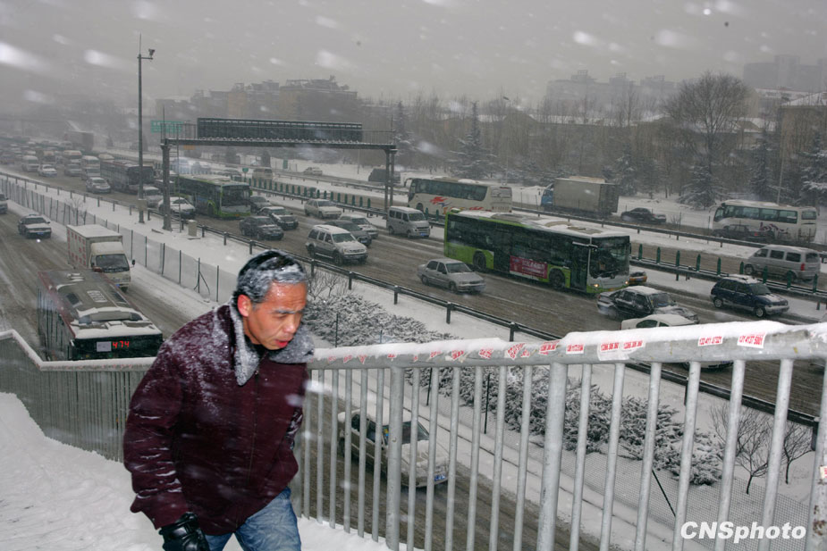 1月3日,北京城降下大雪,積雪深達(dá)6厘米,預(yù)計雪花會飄灑一整天。天氣預(yù)報稱,北京地區(qū)的氣溫有可能達(dá)到-16℃,從而逼近40年來的歷史低溫極值。圖片來源:中國新聞網(wǎng)