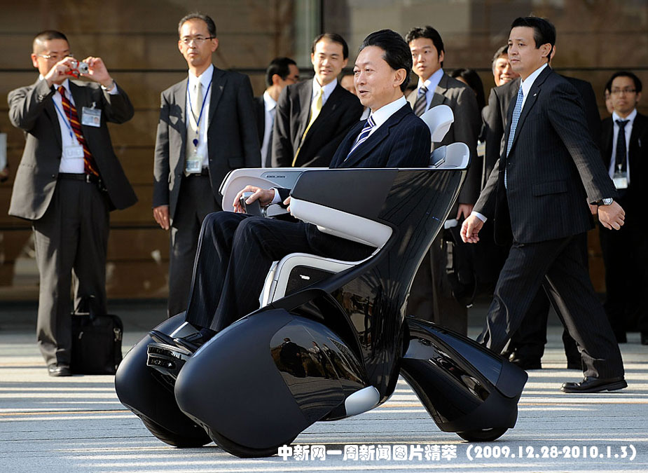 周三(30日),日本首相鳩山由紀夫抵達日本某公司試駕該公司生產的“i-Real”單人用交通工具!癷-Real”由輕質的碳纖維和塑膠制成,控制方式由傳統(tǒng)汽車的方向盤操作改為兩側手臂休息處的控制面板,最高時速可達18.6英里/時。圖片來源:中國新聞網