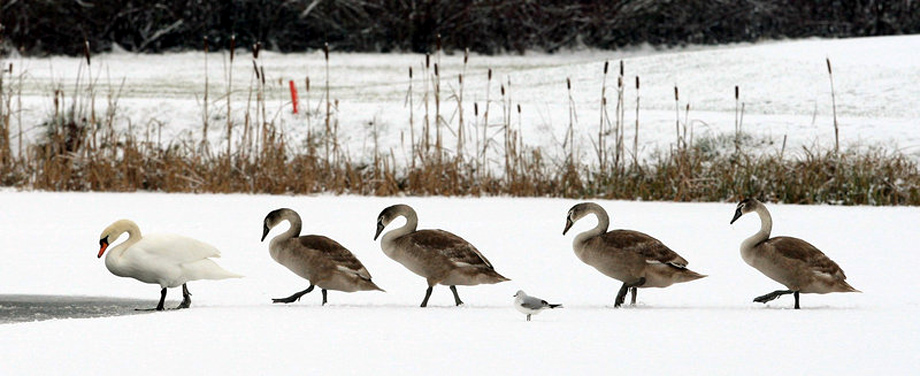 諾丁漢冰凍的湖面上,一群天鵝列隊(duì)接受小鳥的“檢閱”。