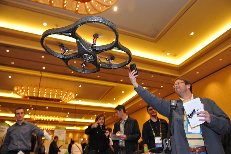圖為國際消費電子展上展示無人駕駛直升機模型。
