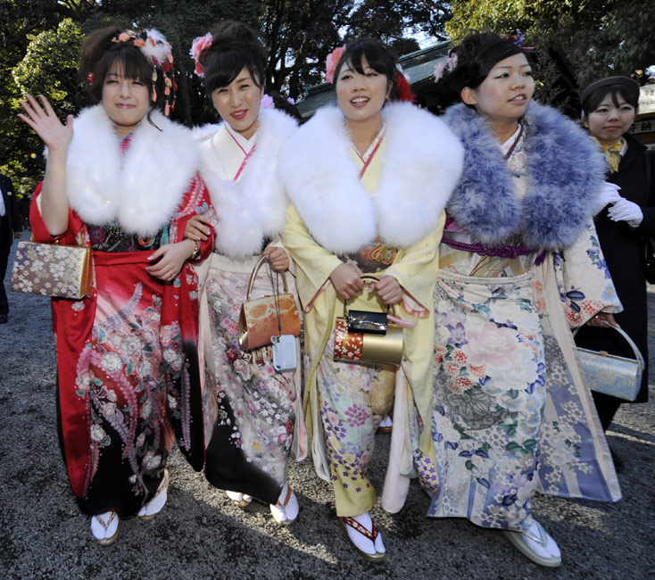 今年的1月11日,是日本傳統(tǒng)的成人節(jié),所有滿20歲的年輕人將宣告自己邁進(jìn)了成人行列。1月8日,日本一家公司年滿20歲的年輕女孩紛紛穿上和服,到廟宇中祈福,提前慶祝成人節(jié)的到來。
