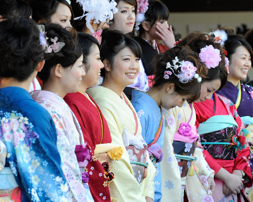 今年的1月11日,是日本傳統(tǒng)的成人節(jié),所有滿20歲的年輕人將宣告自己邁進了成人行列。1月8日,日本一家公司年滿20歲的年輕女孩紛紛穿上和服,到廟宇中祈福,提前慶祝成人節(jié)的到來。