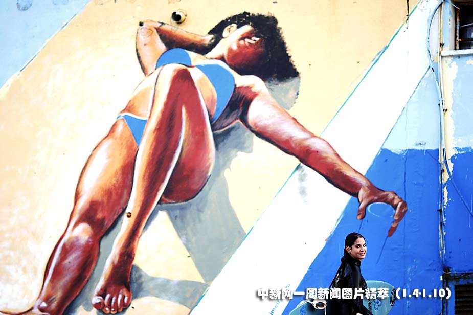 1月4日,(周一)在特拉維夫,一名女孩在地中海沖浪后走過一幅壁畫。當(dāng)日海浪最高達8英尺。圖片來源:中國新聞網(wǎng)