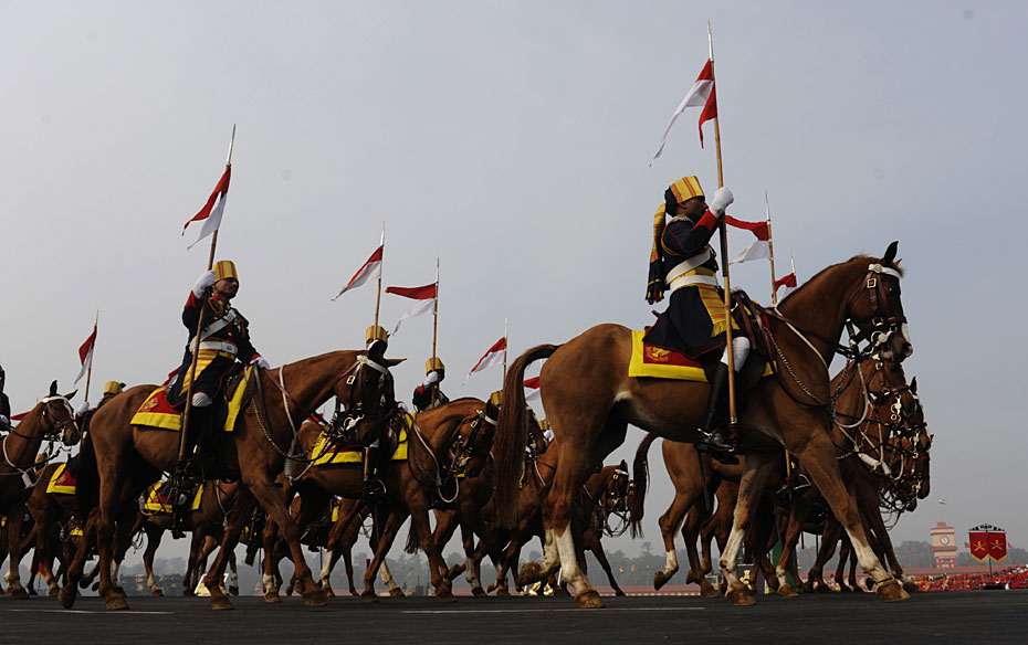 圖為印度陸軍騎兵在建軍節(jié)上進行隊列表演。