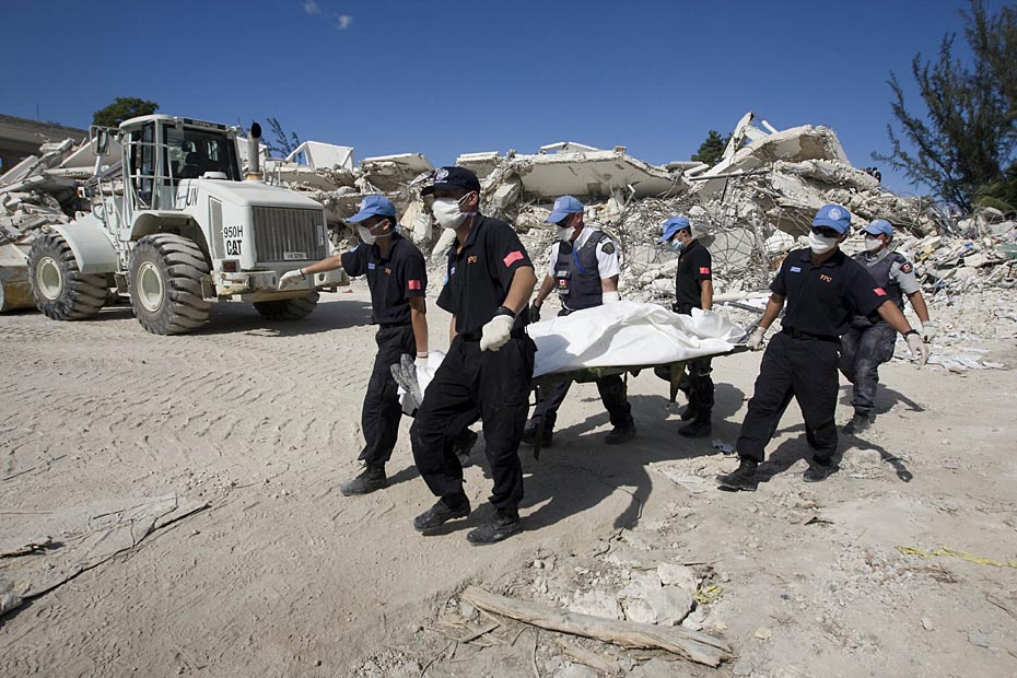 1月16日,海地首都太子港,中國國際救援隊在聯(lián)海團(tuán)總部對遇難者進(jìn)行搜尋工作。此前八名中方失蹤人員的遺體已全被找到。圖片來源:中國新聞網(wǎng)