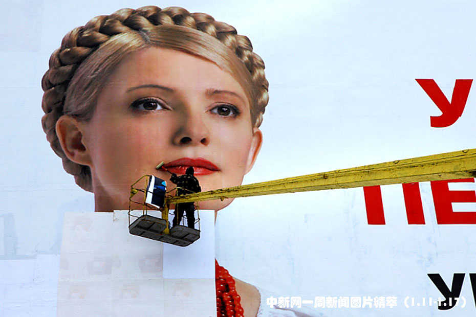 1月14日(周四),一名工人在基輔張貼烏克蘭總理季莫申科(Yulia Tymoshenko)的巨幅海報。她向選民承諾若當選總統(tǒng),將修復烏克蘭與俄羅斯的關系。投票從本周日開始。圖片來源:中國新聞網(wǎng)